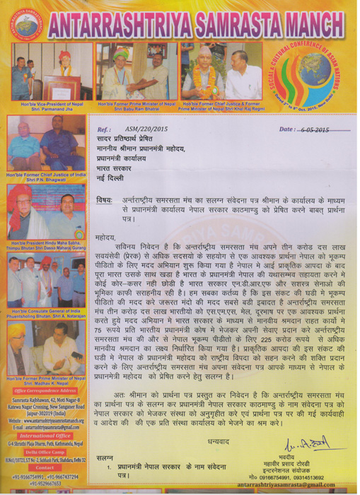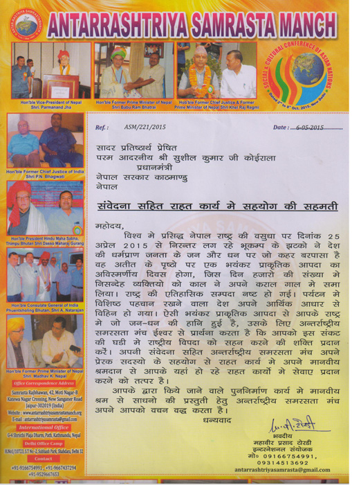 नेपाल के भूम्कप पीडितो के लिए अन्तर्राष्ट्रीय समरसता मंच के माध्यम से मदद अभियान
