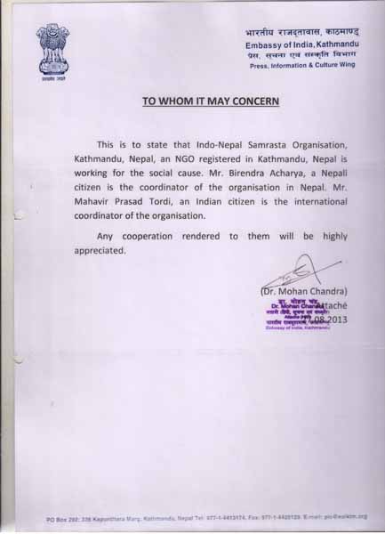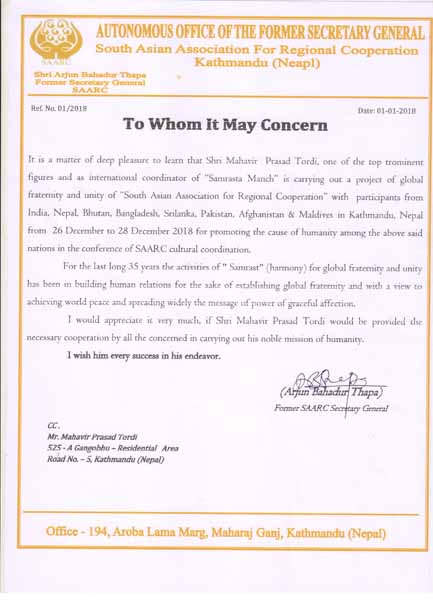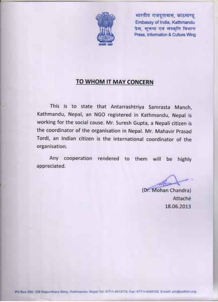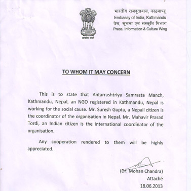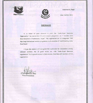 It is a Matter of great pleasure that "Indo-Nepal Samrasta International Congress" has started their 25 point mission programme on 1st October 2010 From Holyland of Kathmandu, Nepal. They approched me to inaugurate 7300 say long international mission programme in all countries of world stating today from Nepal.