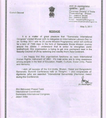 It is a Matter of great pleasure that "Samrasta International Congress" visited Bhutan with 25 points mission Programme, which will continue for a total of 7300 days in the form of Samrasta Social Mission Journey around the Globe.